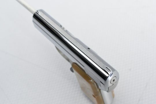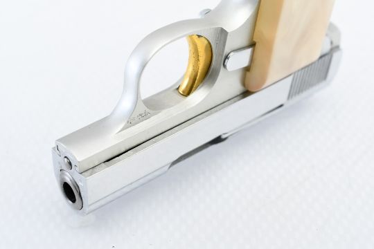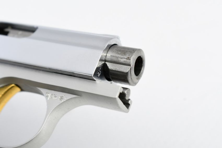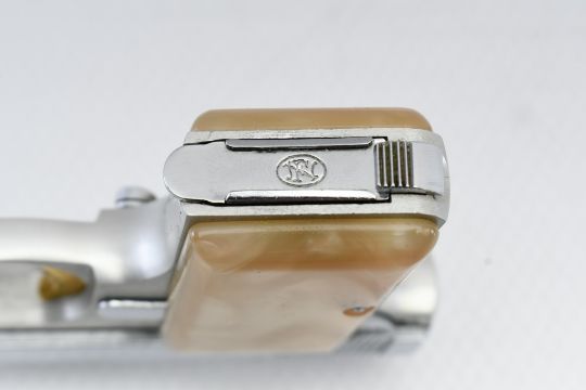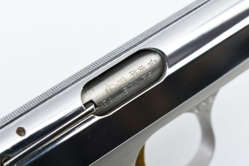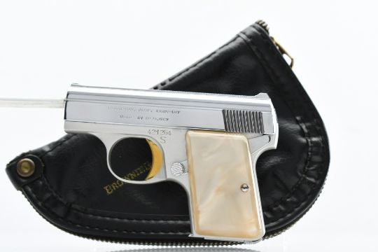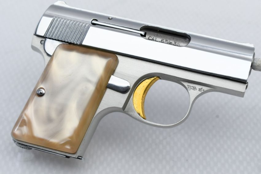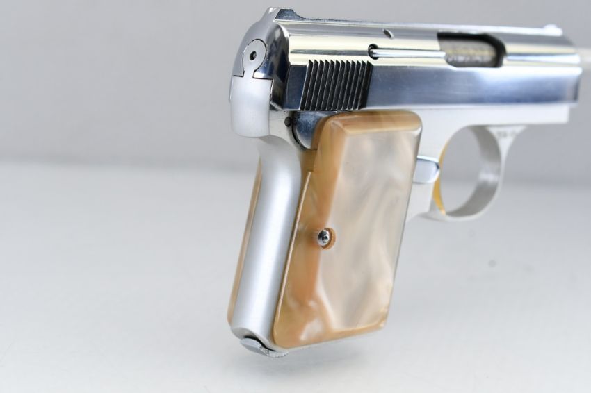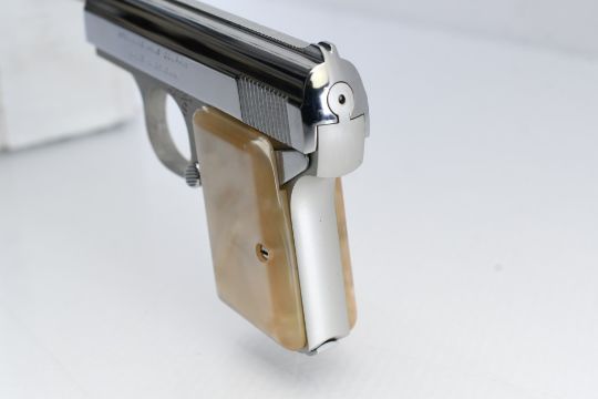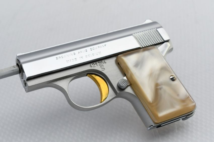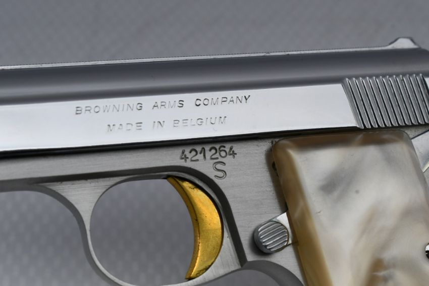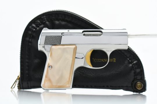According to Browning's .25 Automatic Pistol serial number chart, this "Baby" Browning was produced in 1968. SPECS: Silver-anodized aluminum alloy frame, gold-finished trigger, chrome-plated slide, safety lever, 6-round chrome magazine, and factory faux Mother of Pearl grips. COMES WITH: Original Browning black leather soft case. CONDITION: This pistol is in beautiful condition with no wear to speak of, has a perfect sharp/ clean bore and appears to be in good working order. HISTORY: The Browning Baby Lightweight Model was introduced in 1955 as a lighter version of the original steel-framed Baby, and remained in production until 1968 when the U.S. Gun Control Act of 1968 made it illegal to import into the States. FREE SHIPPING & NO PROCESSING FEES.