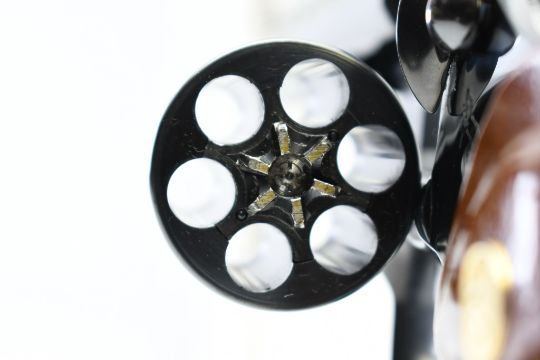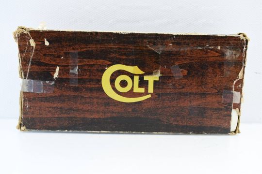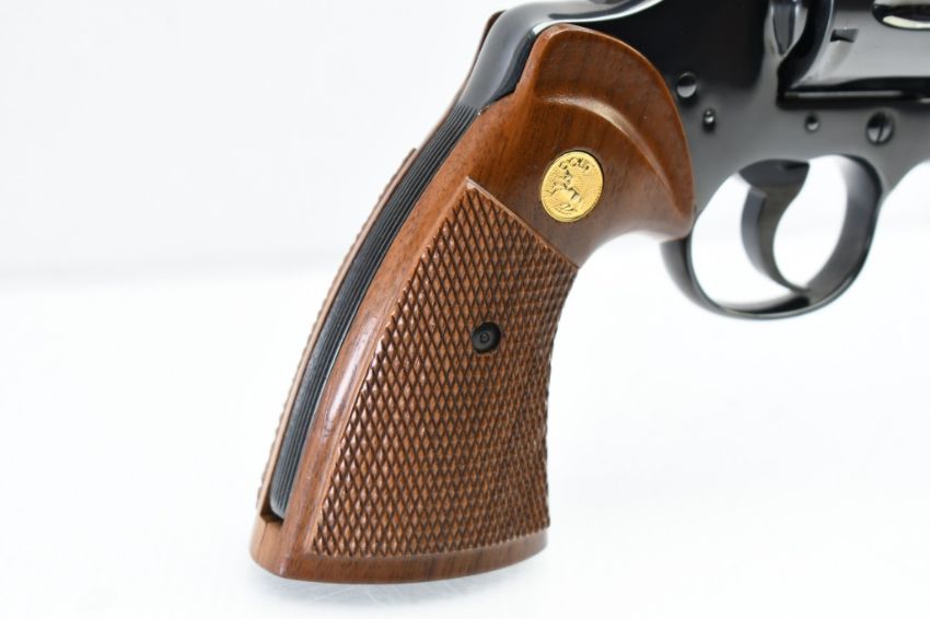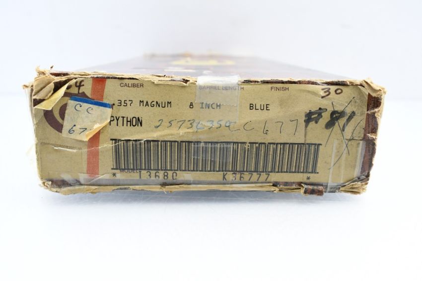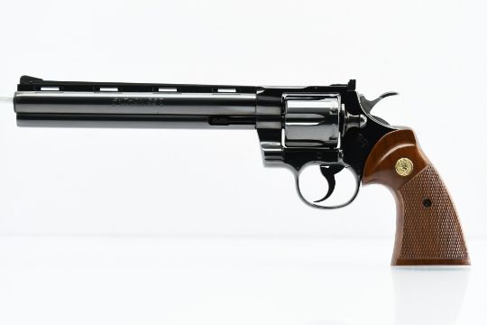According to Colt Archives Serial Number Database, this Python was produced in 1981. SPECS: 8" vent-rib barrel with full length lug & shrouded extractor rod, adjustable rear sight pinned to the channel, dual-pinned ramped front sight, polished blued finish, checkered flat-butt walnut grips with gloss finish & Rampant Colt gold medallion inlays, serrated hammer and six-shot swing-out cylinder. COMES WITH: Original box (no manual). CONDITION: This one-owner gun is in beautiful condition with no wear to speak of, has a perfect sharp/ clean bore (possibly unfired) and appears to be in good working order (exceptionally smooth action). HISTORY: The Colt Python was cataloged from 1955 to 2005, and then re-introduced in 2020. It was offered on a special order basis from Colt's Custom Shop until 2007. It was designed and intended for the premium revolver market segment. Some firearm collectors and writers have described the Python as "The Finest Production Revolver Ever Made". The Colt Python is a double-action 6-shot revolver chambered primarily for the .357 Magnum cartridge built on Colt's large I-frame. Pythons have a reputation for accuracy, smooth trigger pull, and a tight cylinder lock-up. In recent years, early/ original Colt Pythons have become firmly seated at the "Collector Grade" table. These days, no "high end" firearms collection is complete without an original Python. FREE SHIPPING & NO PROCESSING FEES.